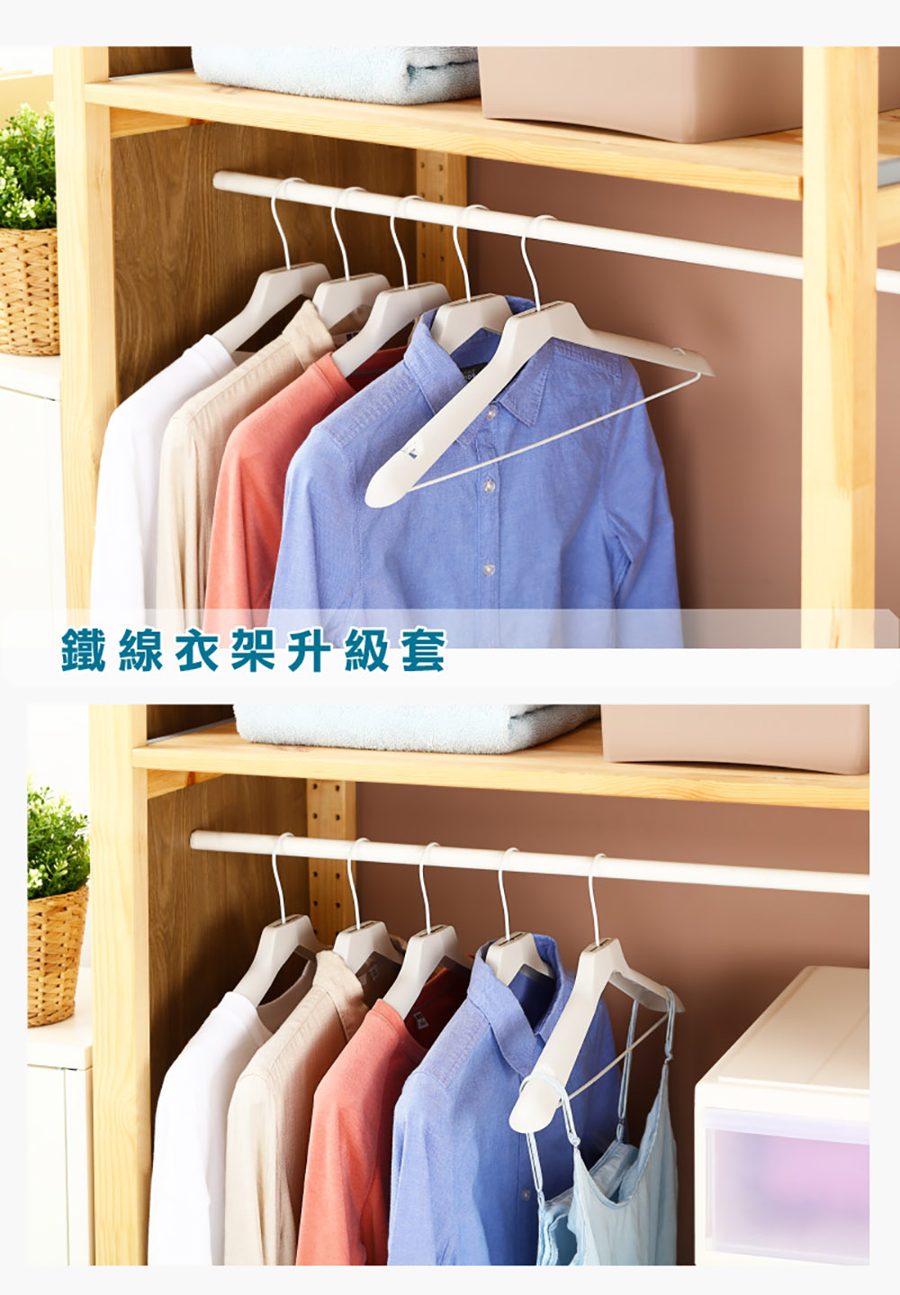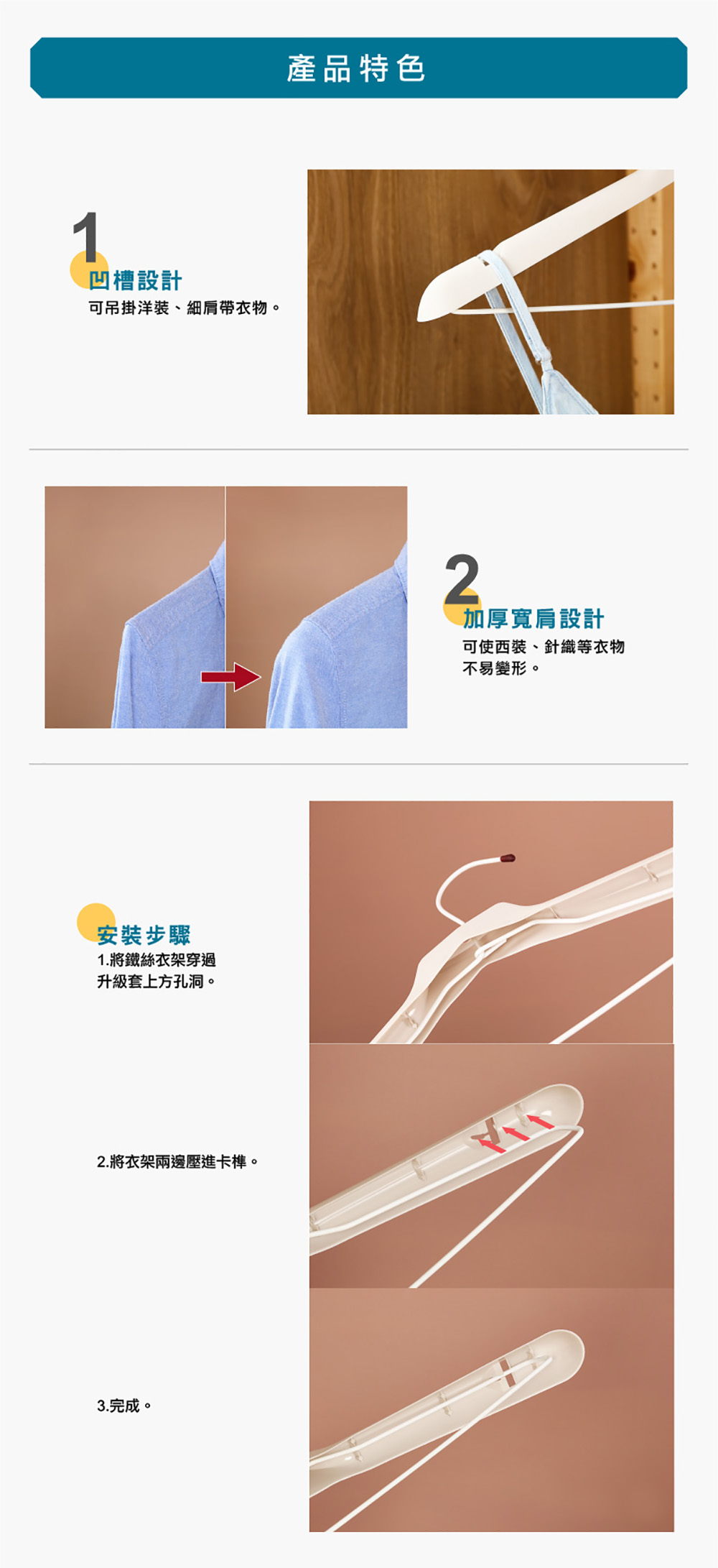 將鐵線衣架套上升級套,加厚寬肩設計,可使西裝、針織等衣物不易變形,凹槽設計,可吊掛洋裝、細肩帶衣物,亦可堆疊收納,節省空間。