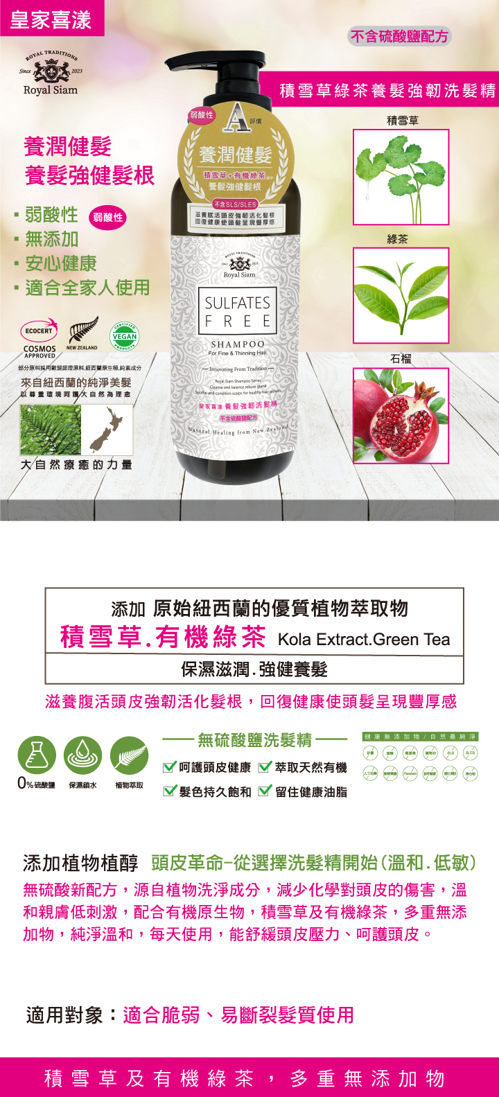 無硫酸新配方,源自植物洗淨成分,減少化學對頭皮的傷害,溫和親膚低刺激,配合有機原生物,積雪草及有機綠茶,多重無添加物,純淨溫和。